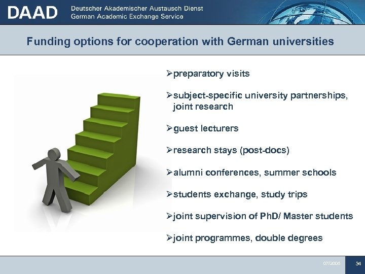 Funding options for cooperation with German universities Øpreparatory visits Øsubject-specific university partnerships, joint research Øguest lecturers Øresearch stays (post-docs) Øalumni conferences, summer schools Østudents exchange, study trips Øjoint supervision of Ph. D/ Master students Øjoint programmes, double degrees 07/2008 34