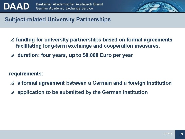 Subject-related University Partnerships p funding for university partnerships based on formal agreements facilitating long-term exchange and cooperation measures. p duration: four years, up to 50. 000 Euro per year requirements: p a formal agreement between a German and a foreign institution p application to be submitted by the German institution 07/2008 35