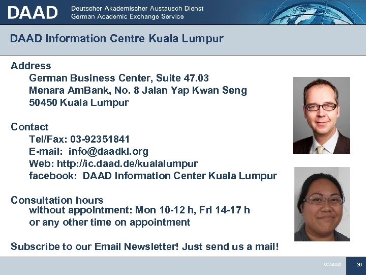 DAAD Information Centre Kuala Lumpur Address German Business Center, Suite 47. 03 Menara Am. Bank, No. 8 Jalan Yap Kwan Seng 50450 Kuala Lumpur Contact Tel/Fax: 03 -92351841 E-mail: info@daadkl. org Web: http: //ic. daad. de/kualalumpur facebook: DAAD Information Center Kuala Lumpur Consultation hours without appointment: Mon 10 -12 h, Fri 14 -17 h or any other time on appointment Subscribe to our Email Newsletter! Just send us a mail! 07/2008 36