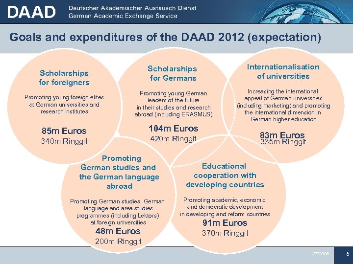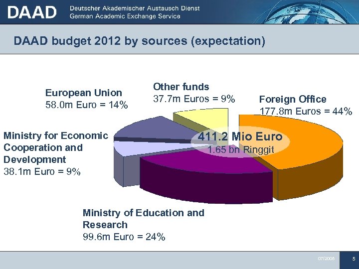 DAAD is your partner. Worldwide. • We promote academic co-operation between Germany and the world, especially through the exchange of students, graduates, scientists and researchers To achieve this, we • provide a variety of different scholarships for Malaysians and Germans; • help to establish and fund co-operation between German and Malaysian universities; • offer free information and counseling on study and research opportunities in Germany; • promote German language and German studies in Malaysia. 07/2008 4