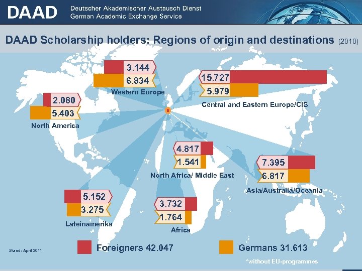 DAAD Scholarship holders: Regions of origin and destinations (2010) 3. 144 6. 834 15. 727 5. 979 Western Europe 2. 080 5. 403 Central and Eastern Europe/CIS North America 4. 817 1. 541 North Africa/ Middle East 5. 152 3. 275 Lateinamerika Stand: April 2011 7. 395 6. 817 Asia/Australia/Oceania 3. 732 1. 764 Africa Foreigners 42. 047 Germans 31. 613 *without EU-programmes 07/2008 7