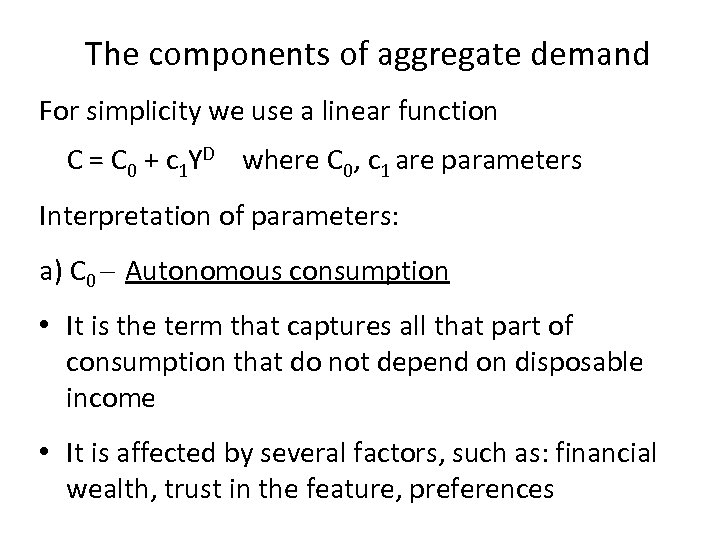 The components of aggregate demand For simplicity we use a linear function C = C 0 + c 1 YD where C 0, c 1 are parameters Interpretation of parameters: a) C 0 – Autonomous consumption • It is the term that captures all that part of consumption that do not depend on disposable income • It is affected by several factors, such as: financial wealth, trust in the feature, preferences