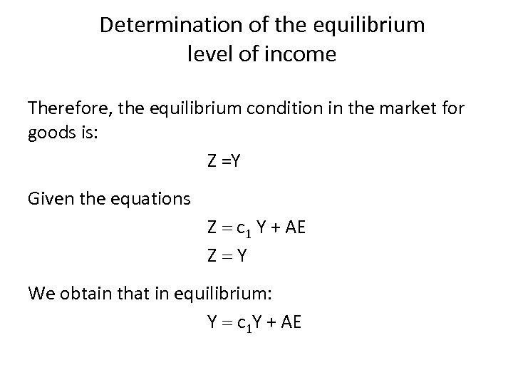 Determination of the equilibrium level of income Therefore, the equilibrium condition in the market for goods is: Z =Y Given the equations Z = c 1 Y + AE Z=Y We obtain that in equilibrium: Y = c 1 Y + AE