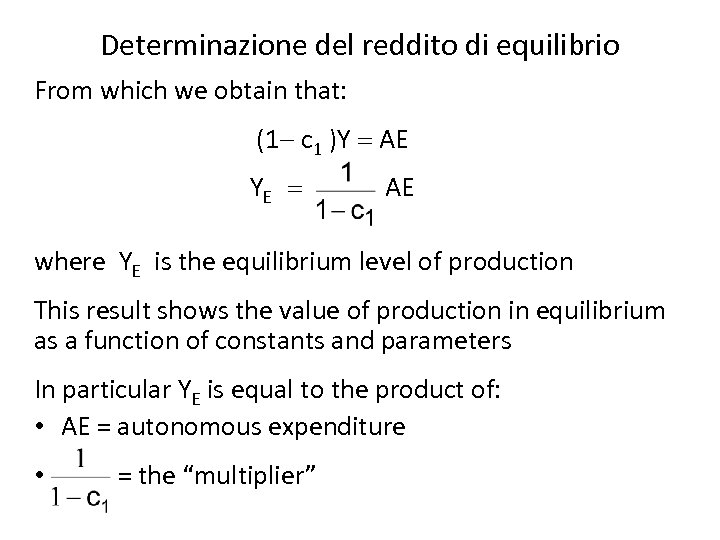 Determinazione del reddito di equilibrio From which we obtain that: (1 - c 1 )Y = AE YE = AE where YE is the equilibrium level of production This result shows the value of production in equilibrium as a function of constants and parameters In particular YE is equal to the product of: • AE = autonomous expenditure • = the “multiplier”