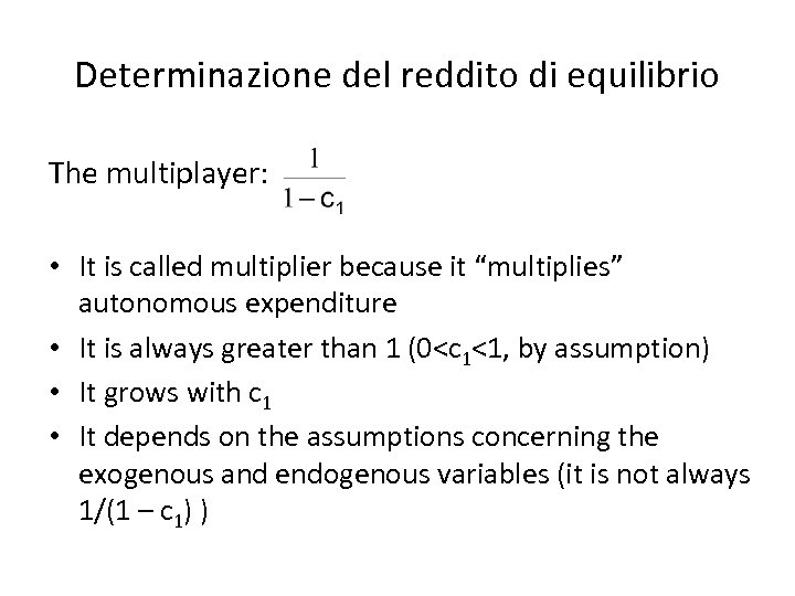 Determinazione del reddito di equilibrio The multiplayer: • It is called multiplier because it “multiplies” autonomous expenditure • It is always greater than 1 (0