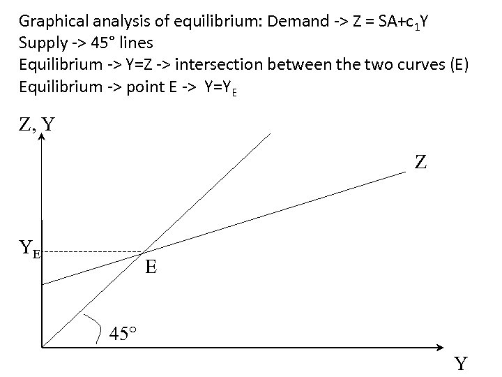Graphical analysis of equilibrium: Demand -> Z = SA+c 1 Y Supply -> 45° lines Equilibrium -> Y=Z -> intersection between the two curves (E) Equilibrium -> point E -> Y=YE Z, Y Z YE E 45° Y