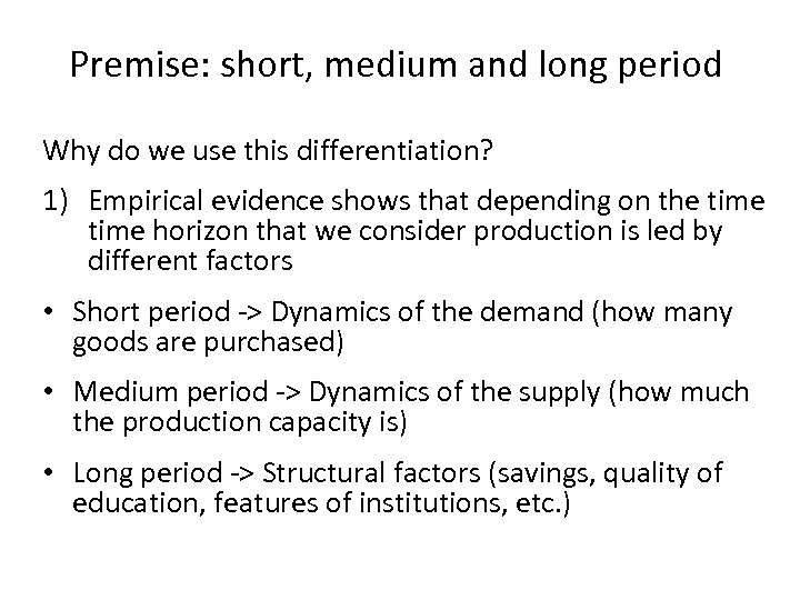 Premise: short, medium and long period Why do we use this differentiation? 1) Empirical evidence shows that depending on the time horizon that we consider production is led by different factors • Short period -> Dynamics of the demand (how many goods are purchased) • Medium period -> Dynamics of the supply (how much the production capacity is) • Long period -> Structural factors (savings, quality of education, features of institutions, etc. )