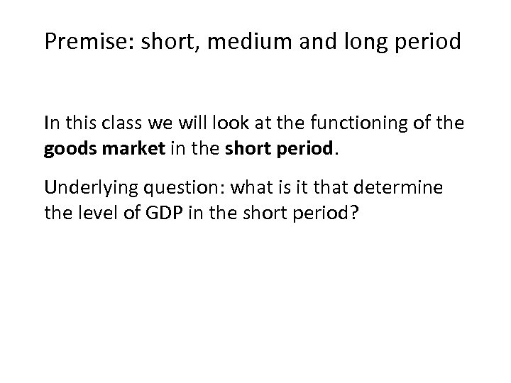Premise: short, medium and long period In this class we will look at the functioning of the goods market in the short period. Underlying question: what is it that determine the level of GDP in the short period?
