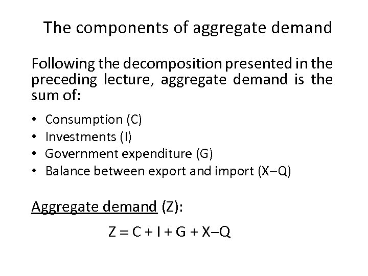 The components of aggregate demand Following the decomposition presented in the preceding lecture, aggregate demand is the sum of: • • Consumption (C) Investments (I) Government expenditure (G) Balance between export and import (X-Q) Aggregate demand (Z): Z = C + I + G + X-Q