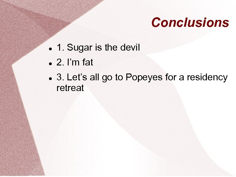 Conclusions 1. Sugar is the devil 2. I’m fat 3. Let’s all go to Popeyes for a residency retreat