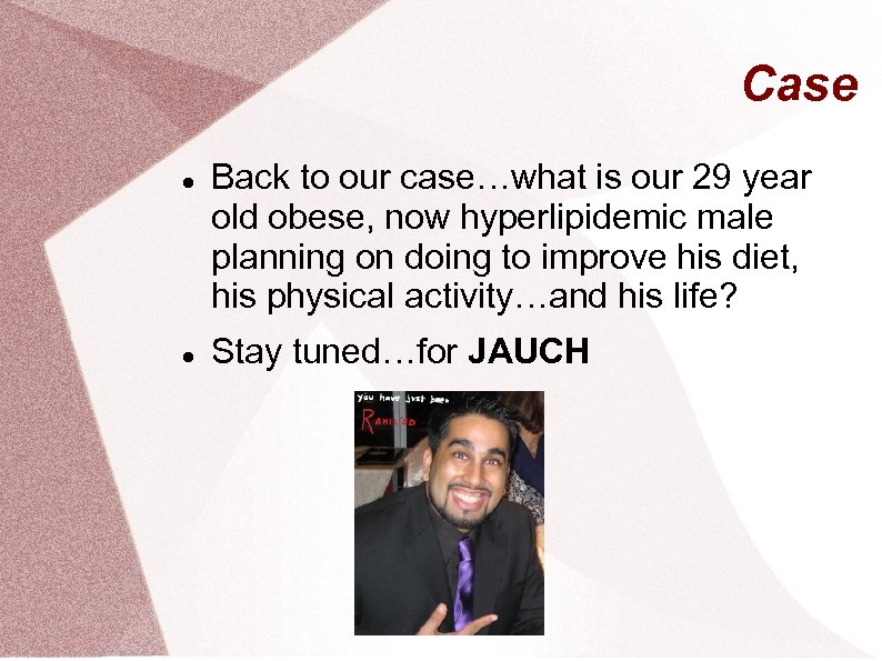 Case Back to our case…what is our 29 year old obese, now hyperlipidemic male planning on doing to improve his diet, his physical activity…and his life? Stay tuned…for JAUCH