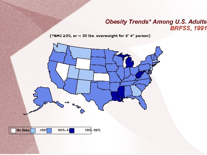 Obesity Trends* Among U. S. Adults BRFSS, 1991 (*BMI ≥ 30, or ~ 30 lbs. overweight for 5’ 4” person) No Data <10% 10%– 14% 15%– 19%