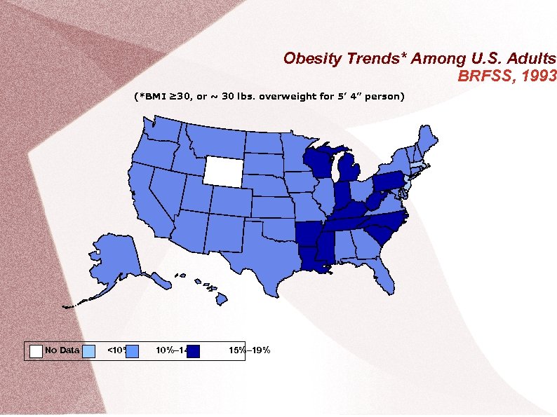 Obesity Trends* Among U. S. Adults BRFSS, 1993 (*BMI ≥ 30, or ~ 30 lbs. overweight for 5’ 4” person) No Data <10% 10%– 14% 15%– 19%