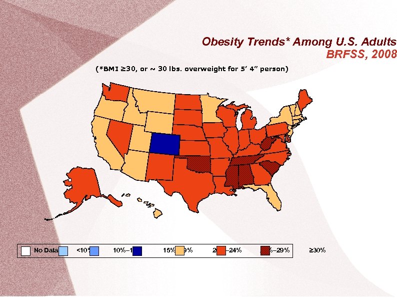 Obesity Trends* Among U. S. Adults BRFSS, 2008 (*BMI ≥ 30, or ~ 30 lbs. overweight for 5’ 4” person) No Data <10% 10%– 14% 15%– 19% 20%– 24% 25%– 29% ≥ 30%