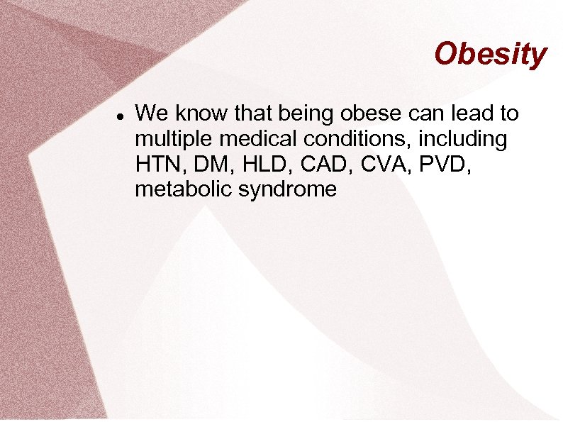 Obesity We know that being obese can lead to multiple medical conditions, including HTN, DM, HLD, CAD, CVA, PVD, metabolic syndrome