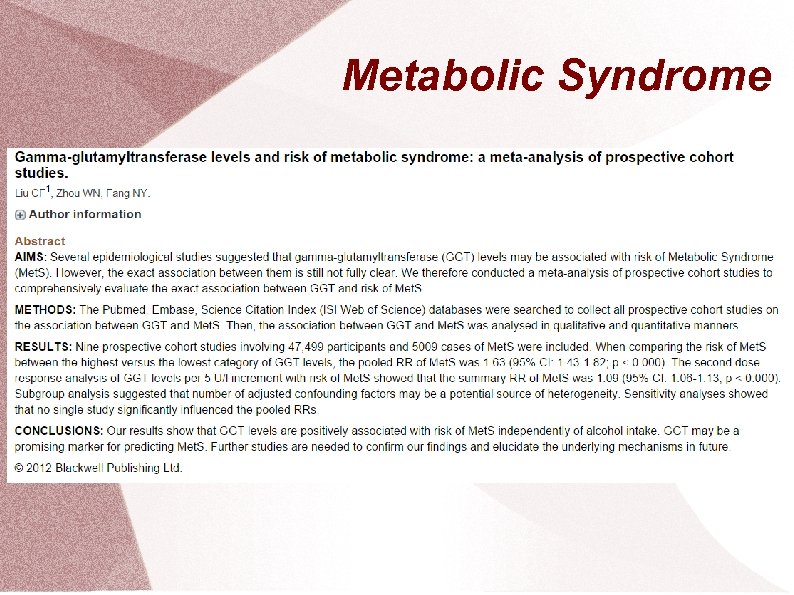 Metabolic Syndrome • International Diabetes Federation definition of metabolic syndrome requires both central obesity defined as waist circumference at least • 94 cm for Europoid men or 80 cm for Europoid women • 90 cm for South Asian and South-East Asian men or 80 cm for South Asian and South -East Asian women • 85 cm for Japanese men or 90 cm for Japanese women • and any 2 of 4 other factors • serum triglyceride level 1. 7 mmol/L (151 mg/d. L) or higher (or specific treatment for this abnormality) • serum high-density lipoprotein cholesterol level < 1. 03 mmol/L (40 mg/d. L) in men or < 1. 29 mmol/L (50 mg/d. L) in women (or specific treatment for this abnormality) • systolic blood pressure 130 mm Hg or higher, diastolic blood pressure 85 mm Hg or higher, or treatment of previously diagnosed hypertension • fasting plasma glucose 5. 6 mmol/L (100 mg/d. L) or higher, or previously diagnosed type 2 diabetes