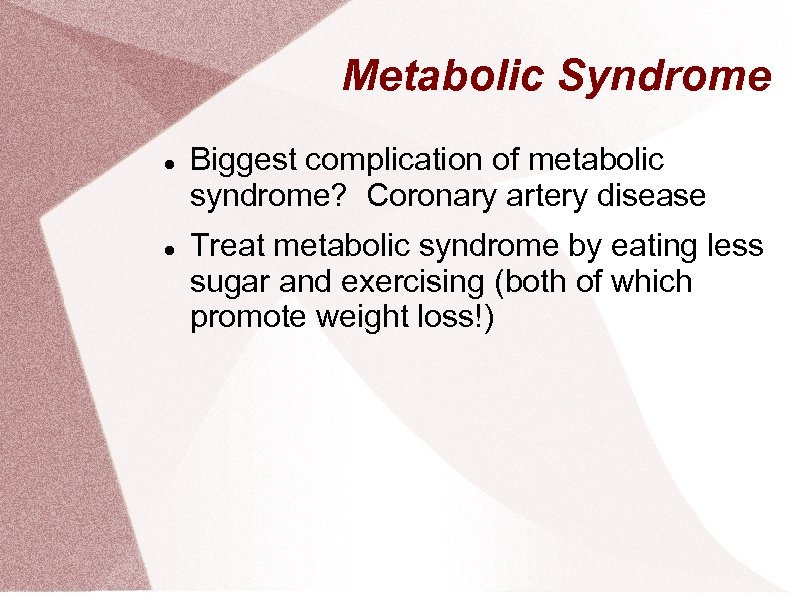 Metabolic Syndrome Biggest complication of metabolic syndrome? Coronary artery disease Treat metabolic syndrome by eating less sugar and exercising (both of which promote weight loss!)