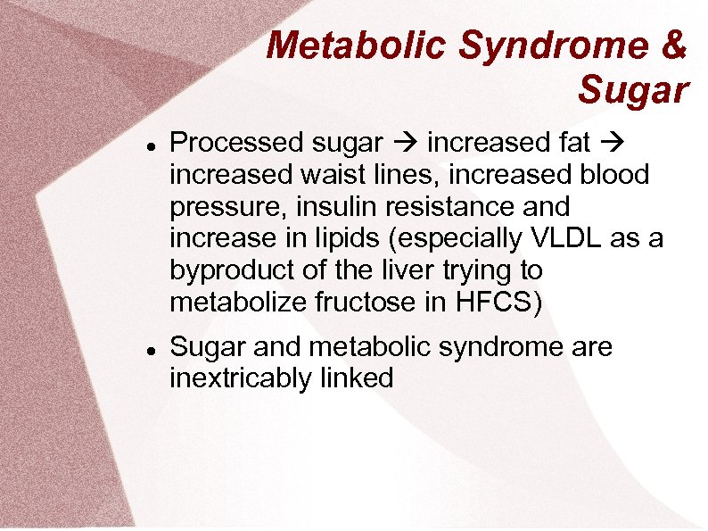Metabolic Syndrome & Sugar Processed sugar increased fat increased waist lines, increased blood pressure, insulin resistance and increase in lipids (especially VLDL as a byproduct of the liver trying to metabolize fructose in HFCS) Sugar and metabolic syndrome are inextricably linked