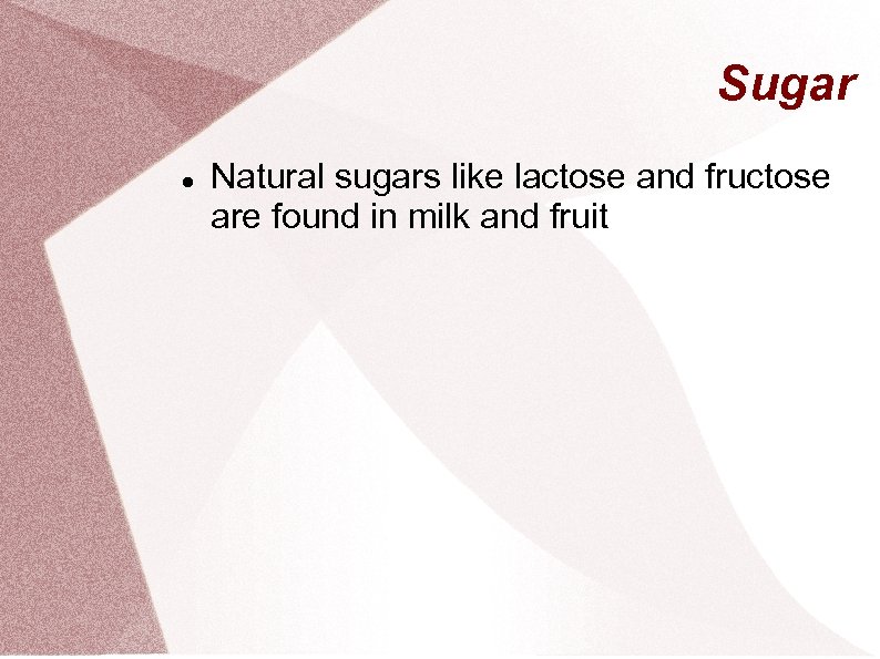 Sugar Natural sugars like lactose and fructose are found in milk and fruit
