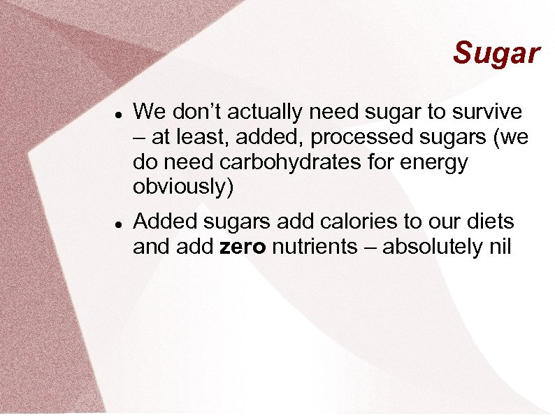 Sugar We don’t actually need sugar to survive – at least, added, processed sugars (we do need carbohydrates for energy obviously) Added sugars add calories to our diets and add zero nutrients – absolutely nil
