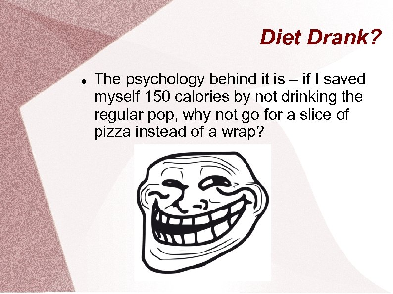 Diet Drank? The psychology behind it is – if I saved myself 150 calories by not drinking the regular pop, why not go for a slice of pizza instead of a wrap?