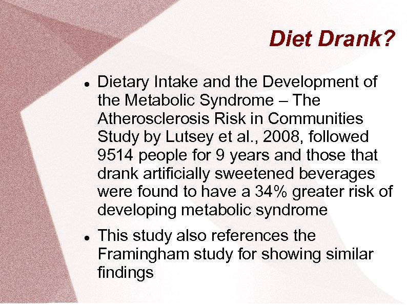 Diet Drank? Dietary Intake and the Development of the Metabolic Syndrome – The Atherosclerosis Risk in Communities Study by Lutsey et al. , 2008, followed 9514 people for 9 years and those that drank artificially sweetened beverages were found to have a 34% greater risk of developing metabolic syndrome This study also references the Framingham study for showing similar findings