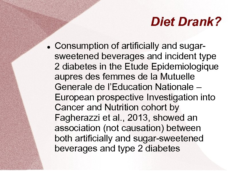 Diet Drank? Consumption of artificially and sugarsweetened beverages and incident type 2 diabetes in the Etude Epidemiologique aupres des femmes de la Mutuelle Generale de l’Education Nationale – European prospective Investigation into Cancer and Nutrition cohort by Fagherazzi et al. , 2013, showed an association (not causation) between both artificially and sugar-sweetened beverages and type 2 diabetes