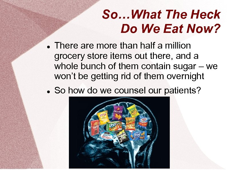 So…What The Heck Do We Eat Now? There are more than half a million grocery store items out there, and a whole bunch of them contain sugar – we won’t be getting rid of them overnight So how do we counsel our patients?
