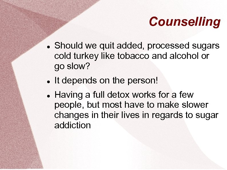 Counselling Should we quit added, processed sugars cold turkey like tobacco and alcohol or go slow? It depends on the person! Having a full detox works for a few people, but most have to make slower changes in their lives in regards to sugar addiction