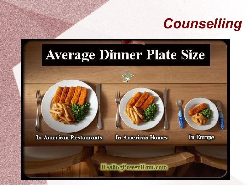 Counselling First step: portion sizes! We used to have reasonable portion sizes until everything was supersized, now what used to be supersized is our norm and what’s supersized now is…