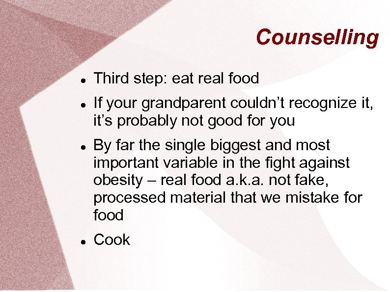 Counselling Third step: eat real food If your grandparent couldn’t recognize it, it’s probably not good for you By far the single biggest and most important variable in the fight against obesity – real food a. k. a. not fake, processed material that we mistake for food Cook