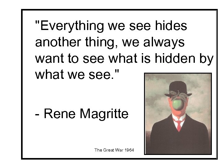 "Everything we see hides another thing, we always want to see what is hidden by what we see. " - Rene Magritte The Great War 1964