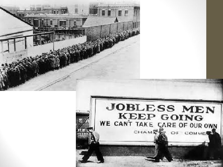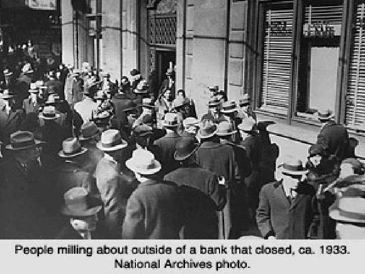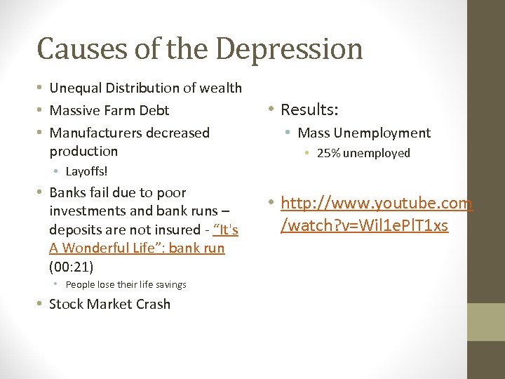 Causes of the Depression • Unequal Distribution of wealth • Massive Farm Debt • Manufacturers decreased production • Results: • Mass Unemployment • 25% unemployed • Layoffs! • Banks fail due to poor investments and bank runs – deposits are not insured - “It's A Wonderful Life”: bank run (00: 21) • People lose their life savings • Stock Market Crash • http: //www. youtube. com /watch? v=Wil 1 e. Pl. T 1 xs