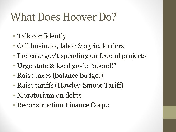What Does Hoover Do? • Talk confidently • Call business, labor & agric. leaders • Increase gov’t spending on federal projects • Urge state & local gov’t: “spend!” • Raise taxes (balance budget) • Raise tariffs (Hawley-Smoot Tariff) • Moratorium on debts • Reconstruction Finance Corp. :