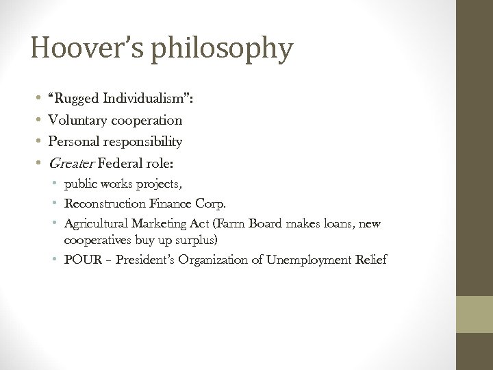 Hoover’s philosophy • • “Rugged Individualism”: Voluntary cooperation Personal responsibility Greater Federal role: • public works projects, • Reconstruction Finance Corp. • Agricultural Marketing Act (Farm Board makes loans, new cooperatives buy up surplus) • POUR – President’s Organization of Unemployment Relief