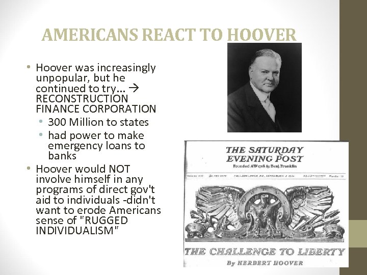 AMERICANS REACT TO HOOVER • Hoover was increasingly unpopular, but he continued to try. . . RECONSTRUCTION FINANCE CORPORATION • 300 Million to states • had power to make emergency loans to banks • Hoover would NOT involve himself in any programs of direct gov't aid to individuals -didn't want to erode Americans sense of "RUGGED INDIVIDUALISM"