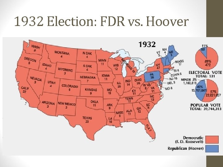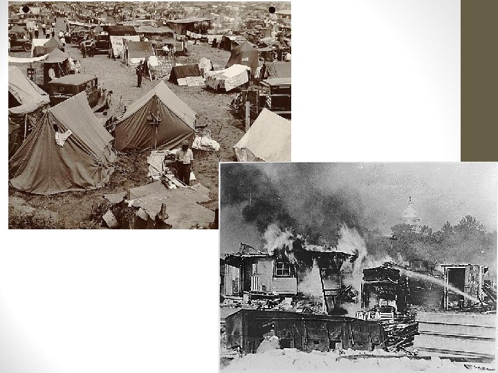 Biggest Political Mistake? “Bonus Army March” Incident • Bonus Army March: “we want our WW I bonuses now- not in 1945 • Camped in D. C. • Congress didn’t approve measure… 1, 000 still camped • Hoover: get them out • U. S. troops (Geo. Patton/D. Mac. Arthur) • Tanks + tear gas + force = “Heartless”