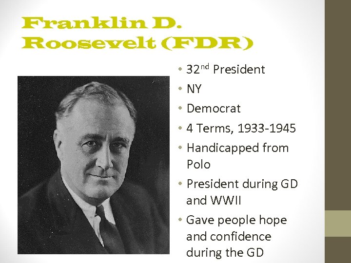 Franklin D. Roosevelt (FDR) • 32 nd President • NY • Democrat • 4 Terms, 1933 -1945 • Handicapped from Polo • President during GD and WWII • Gave people hope and confidence during the GD