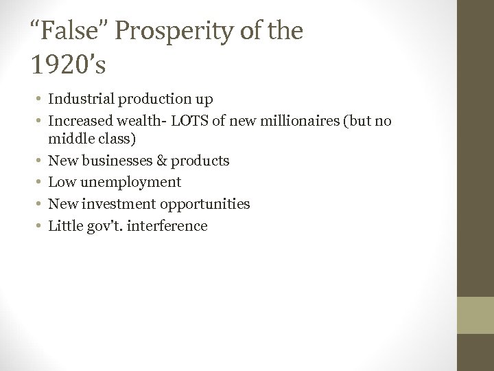 “False” Prosperity of the 1920’s • Industrial production up • Increased wealth- LOTS of new millionaires (but no middle class) • New businesses & products • Low unemployment • New investment opportunities • Little gov’t. interference