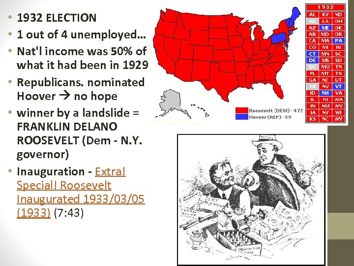 • 1932 ELECTION • 1 out of 4 unemployed… • Nat'l income was 50% of what it had been in 1929 • Republicans. nominated Hoover no hope • winner by a landslide = FRANKLIN DELANO ROOSEVELT (Dem - N. Y. governor) • Inauguration - Extra! Special! Roosevelt Inaugurated 1933/03/05 (1933) (7: 43)