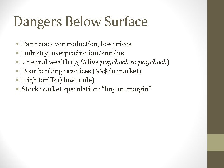 Dangers Below Surface • • • Farmers: overproduction/low prices Industry: overproduction/surplus Unequal wealth (75% live paycheck to paycheck) Poor banking practices ($$$ in market) High tariffs (slow trade) Stock market speculation: “buy on margin”