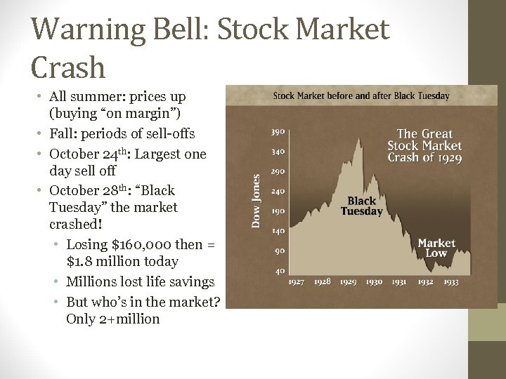 Warning Bell: Stock Market Crash • All summer: prices up (buying “on margin”) • Fall: periods of sell-offs • October 24 th: Largest one day sell off • October 28 th: “Black Tuesday” the market crashed! • Losing $160, 000 then = $1. 8 million today • Millions lost life savings • But who’s in the market? Only 2+million