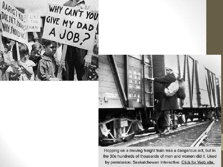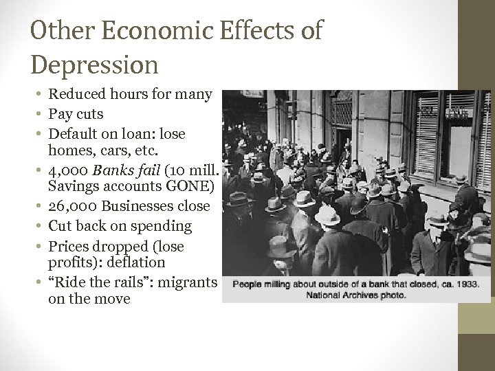 Other Economic Effects of Depression • Reduced hours for many • Pay cuts • Default on loan: lose homes, cars, etc. • 4, 000 Banks fail (10 mill. Savings accounts GONE) • 26, 000 Businesses close • Cut back on spending • Prices dropped (lose profits): deflation • “Ride the rails”: migrants on the move