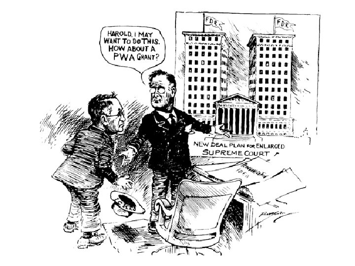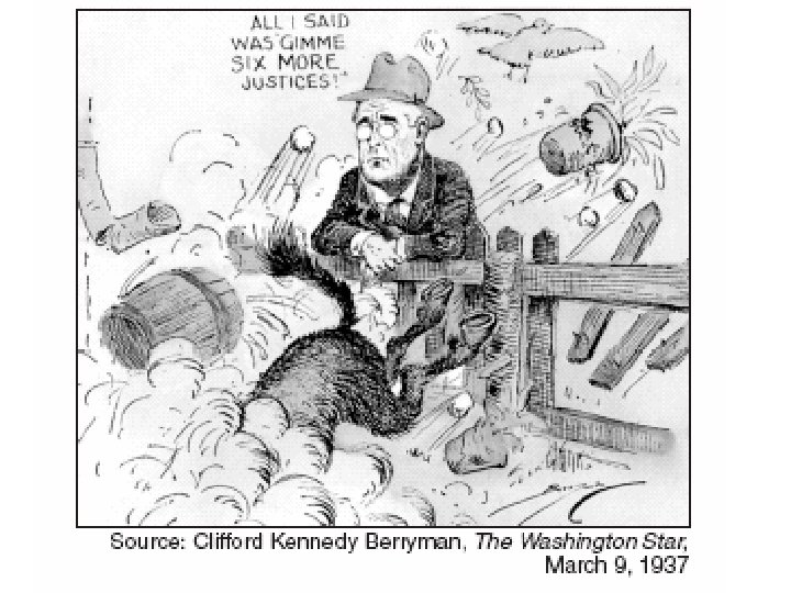 Nine Old Men on the Bench • The 20 th Amendment had cut the lame-duck period down to six weeks, so FDR began his second term on January 20, 1937, instead of on March 4. • He controlled Congress, but the Supreme Court kept blocking many of his programs • So began FDR’s biggest mistake as president: Roosevelt proposed a shocking plan that would add a member to the Supreme Court for every existing member over the age of 70, for a maximum possible total of 15 total members. Essentially, FDR’s “Court-packing” scheme reflected his desire to make the Supreme Court more sympathetic to New Deal programs. – – For once, Congress voted against him because it was fearful of losing its power. Roosevelt was ripped for trying to become a “dictator. ”