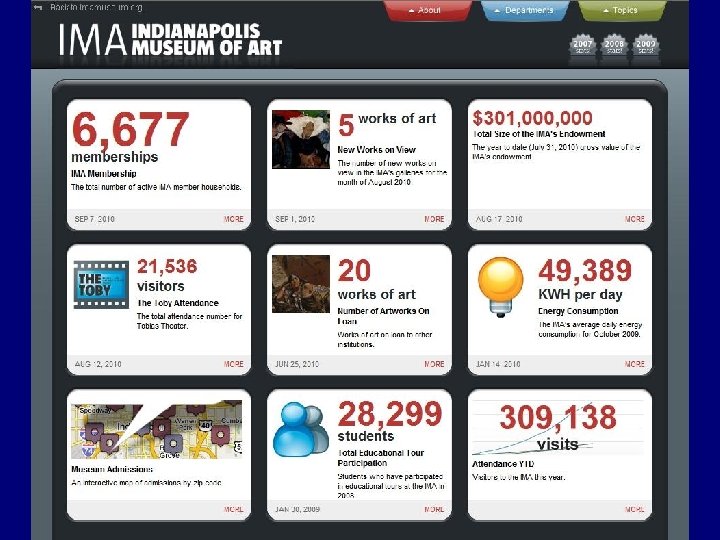 Visualisation • Took inspiration from business websites…. • Hull Museum, UK and Te Papa, NZ websites • And Indianapolis Art Museum. .