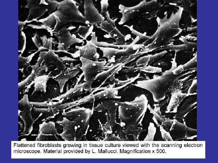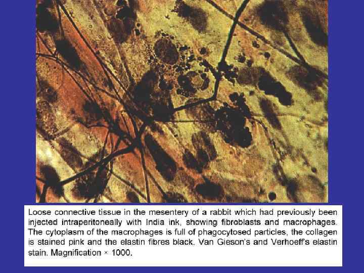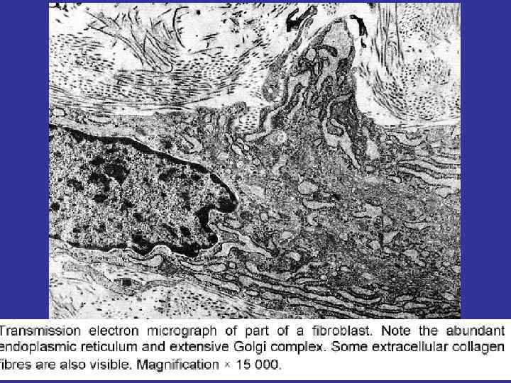 SOURCE FIBROBLASTS – ELEMENTS OF THE DIFFERON, SOURCED OF THE MESENCHIMA. THE PRECURSOR IS THE LOW-DIFFERENTIATED FIBROBLSTS WITH THE HIGH MITOTIC ACTIVITY. FUNCTION MATURE – PRODUCE THE COMPONENTS OF THE GROUND SUBSTANCE: PROTEINS (COLLAGEN & ELASTIN FOR FIBER’S SYNTESIS), PROTEOGLICANS AND GLICOPROTEINS. NUCLEI THERE ARE CELLS WITH THE HIGH LEVEL OF THE SYNTESIS – THIS IS WHY AN EUCHROMATIN MORE IN VOLUME AT THEIR NUCLEI WHICH ONE USUALLY PALE AND OVAL IN SHAPE CYTOPLASMA R-EPR. THE CELLS ARE SPIDER-SHAPED. AND THE CELL’S SHAPE MOTIONS CAN MOVE ALONG FIBERS USING FIBRONECTIN
