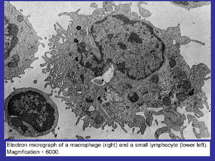 MORPHOLOGY IRREGULAR SHAPED AND PICNIC NUCLEUS. AT THE CITOPLASMA – NUMEROUS VACUOLES AND GRANULES. FUNCTIONS ANTIGEN-PRESENTING, EXCRETION OF THE INTERLEUKINS, PIROGENES (STIMULATING LEUCOCYTORY MIGRATION AND ACTIVITIES), INTERFERON (ACTING AT THE VIRUSES), LISOCIM (ACTING AT THE BACTERIAL GLYCOCALIX), CYTOLITIC FACTORS(ACTING AT THE TUMOR CELLS). FAGOCITOSIS (DEAD CELL AND APOPTOTIC BODIES)