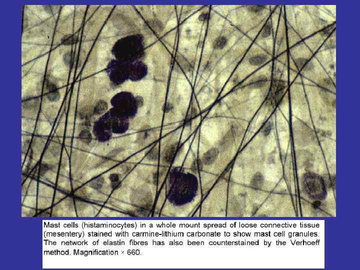 Main feature The presence of the big violet granules (full of heparin and serotonin) localization Near the blood vessels Nuclei Not too big, blue and place at the cell’s centre Granules Non-specific (too small in volume, invisible) Specific – big un volume, well visible. metachromasia The staining of the toluidin blue in 2 colors: