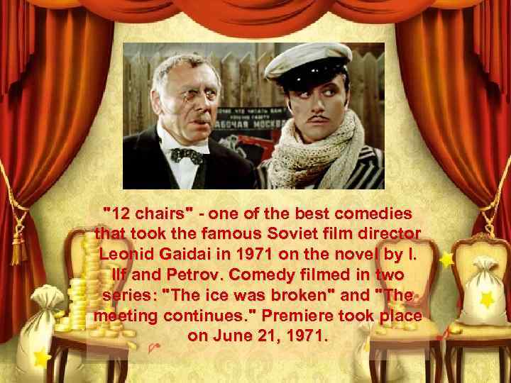 "12 chairs" - one of the best comedies that took the famous Soviet film director Leonid Gaidai in 1971 on the novel by I. Ilf and Petrov. Comedy filmed in two series: "The ice was broken" and "The meeting continues. " Premiere took place on June 21, 1971.