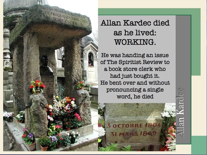 • • 1857 – The Spirits’ Book 1858 - ‘La Revue Spirite’ Journal of Psychological Studies 1861 – The Medium’s Book 1864 - The Gospel According to Spiritism 1865 – Heaven and Hell 1868 – Genesis 1890 – Posthumous Work 1868